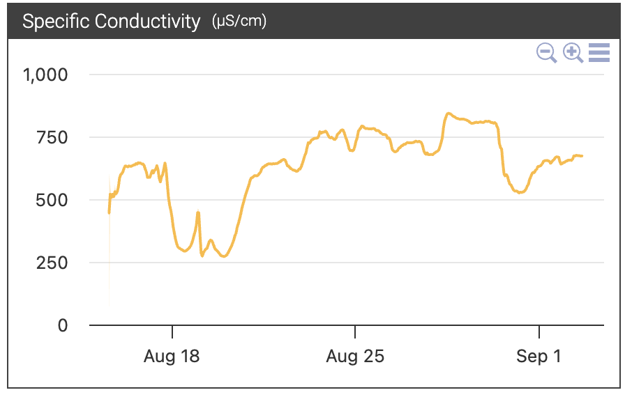 During storms, pure rainwater is able to wash away mineral and salty water, directing it quickly downstream. This pure water has less impurities and is therefore less conductive. Aug 18-20 during a period of heavy rainfall, our live data was able to see the drop in conductivity happen in real time in the Chicago River.